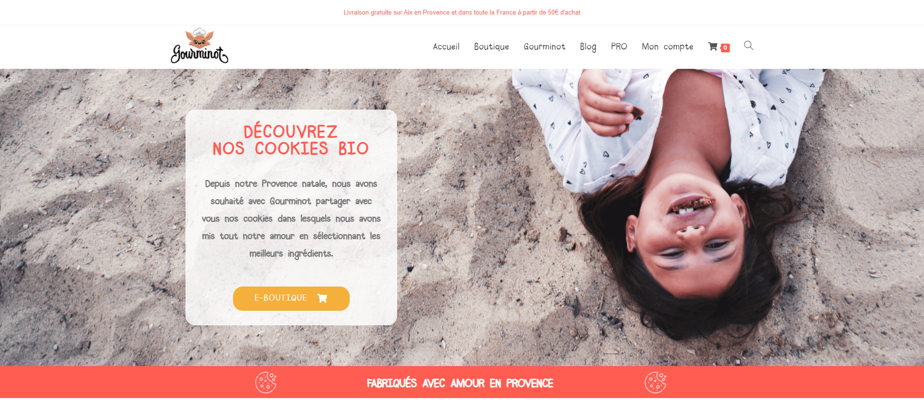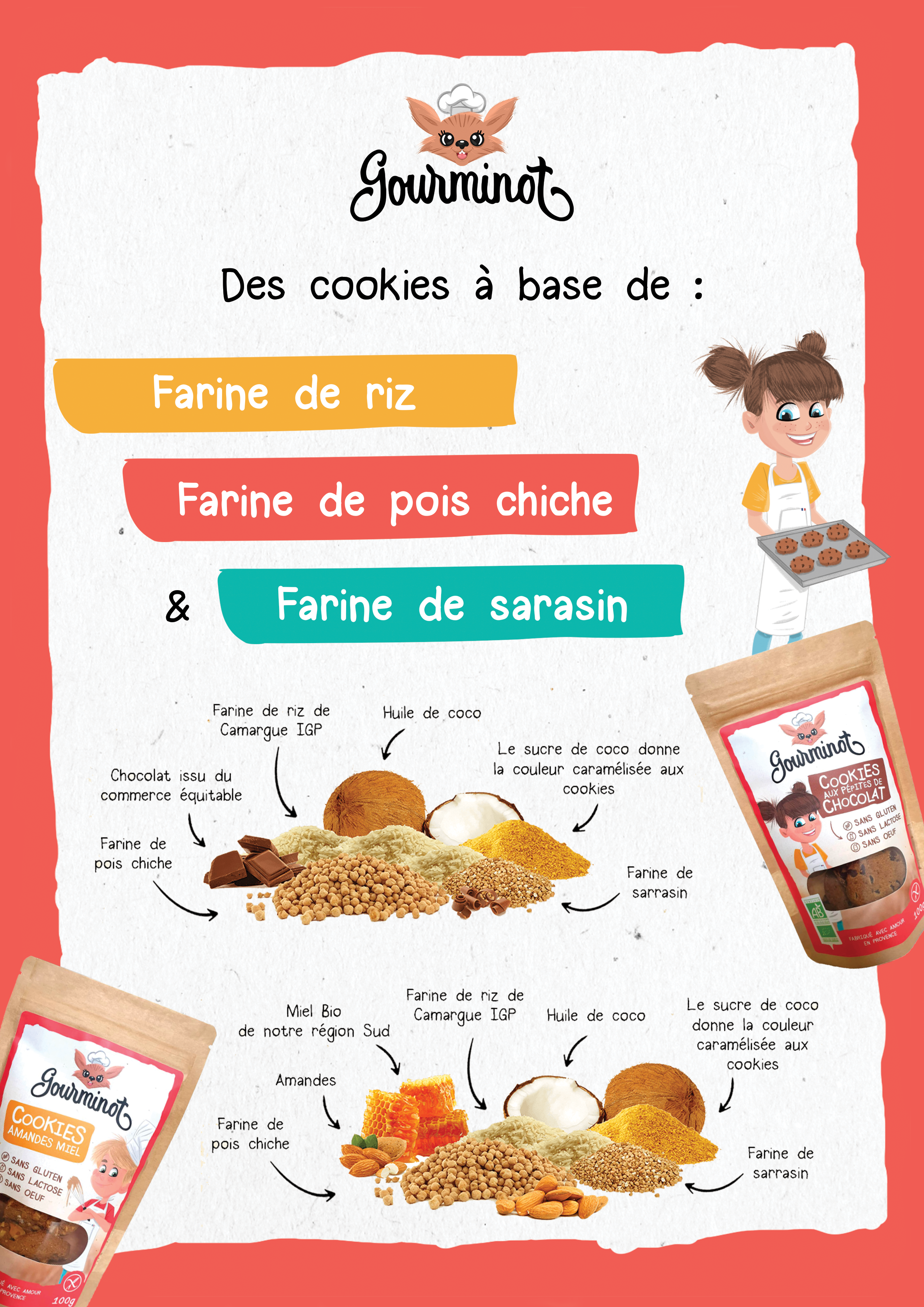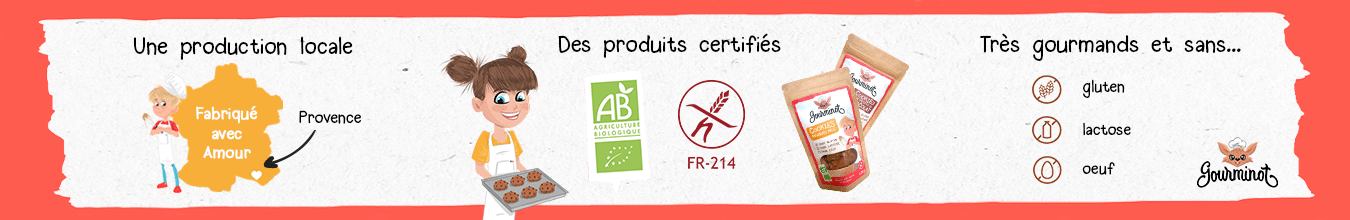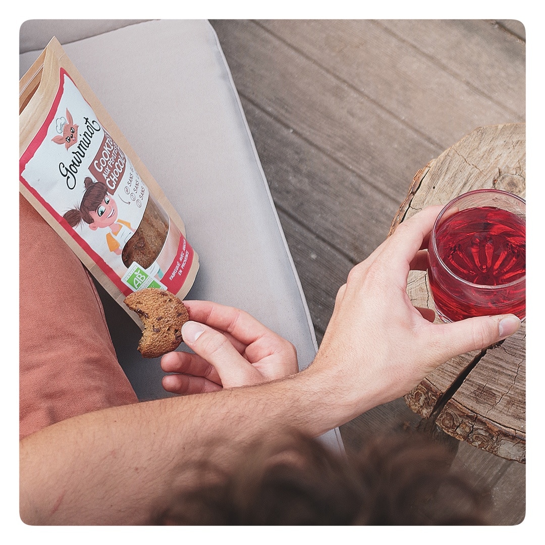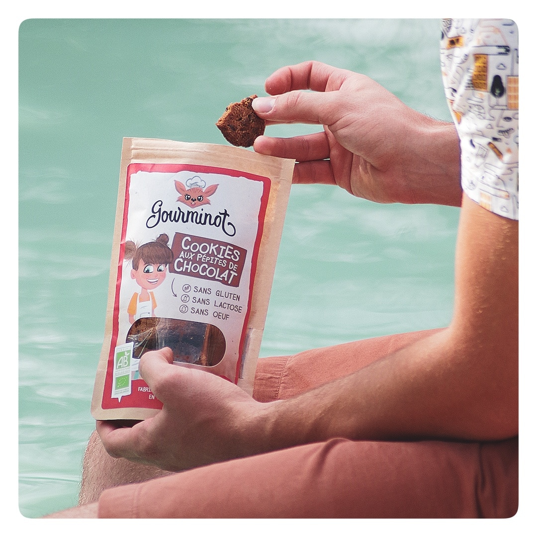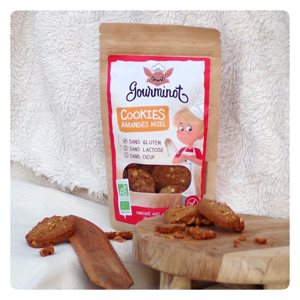GOURMINOT est une marque de Cookies certifiée BIO, sans gluten, sans lactose et sans œufs. 2 parfums sont proposés : Pépites de Chocolat et Amandes Miel.